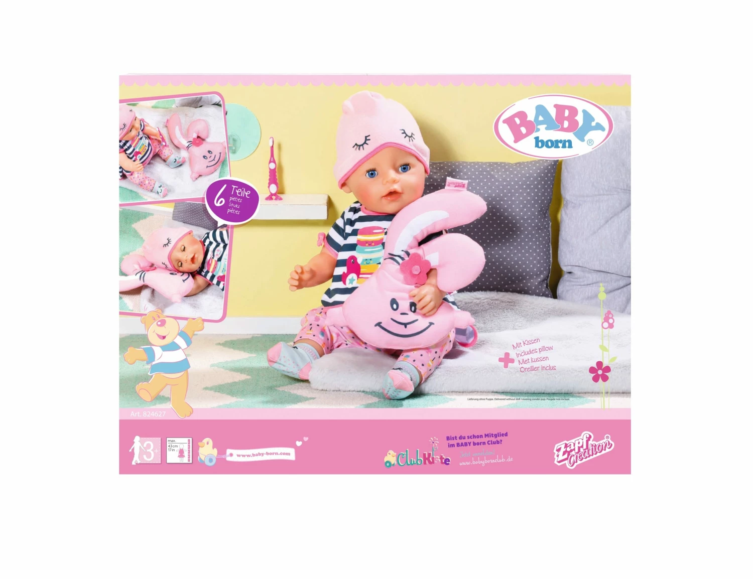 Baby Born Deluxe Sleepover Set for 43cm Dolls features a striped shirt is printed with macarons – colourful French biscuits. Also includes comfortable pyjama bottoms and fun socks. The pink hat can also be pulled down into her face like an eye mask.