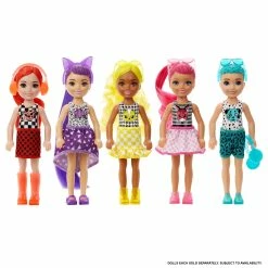 Barbie Color Reveal Chelsea dolls deliver an unboxing experience full of surprises — six of them! A doll with a fun, color-block fashion is guaranteed, but each doll’s look remains a mystery until revealed. The packaging is part of the fun — pull the strip to remove the outer layer and reveal a clear tube. Inside is a mystery color-blocked white and pink Color Reveal Chelsea doll and four bags hiding surprises inside. Remove them all and fill the tube with warm water, then insert the doll and swirl it around. The water turns a light pink color, and when the doll is pulled out, the features are revealed! Each doll has a different combination of eye color, bright sculpted hair color, skin tone and decorated bodice, but the surprises continue…open the bags to discover a bright colored hair piece, patterned black and white skirt or shorts and matching shoes and fashion accessory! Use ice-cold water to reveal a fun graphic on the doll’s bodice — kids can repeat this wow moment over and over again! Each series has a unique theme — these Color Revealâ„¢ dolls are all about bold patterns and bright colors to create a cool color-block look with color-molded hair and bright hair pieces. Use the tube to store these and other favorite Barbie accessories. Which doll will you reveal? Kids can collect them to mix and match accessories and expand the possibilities!