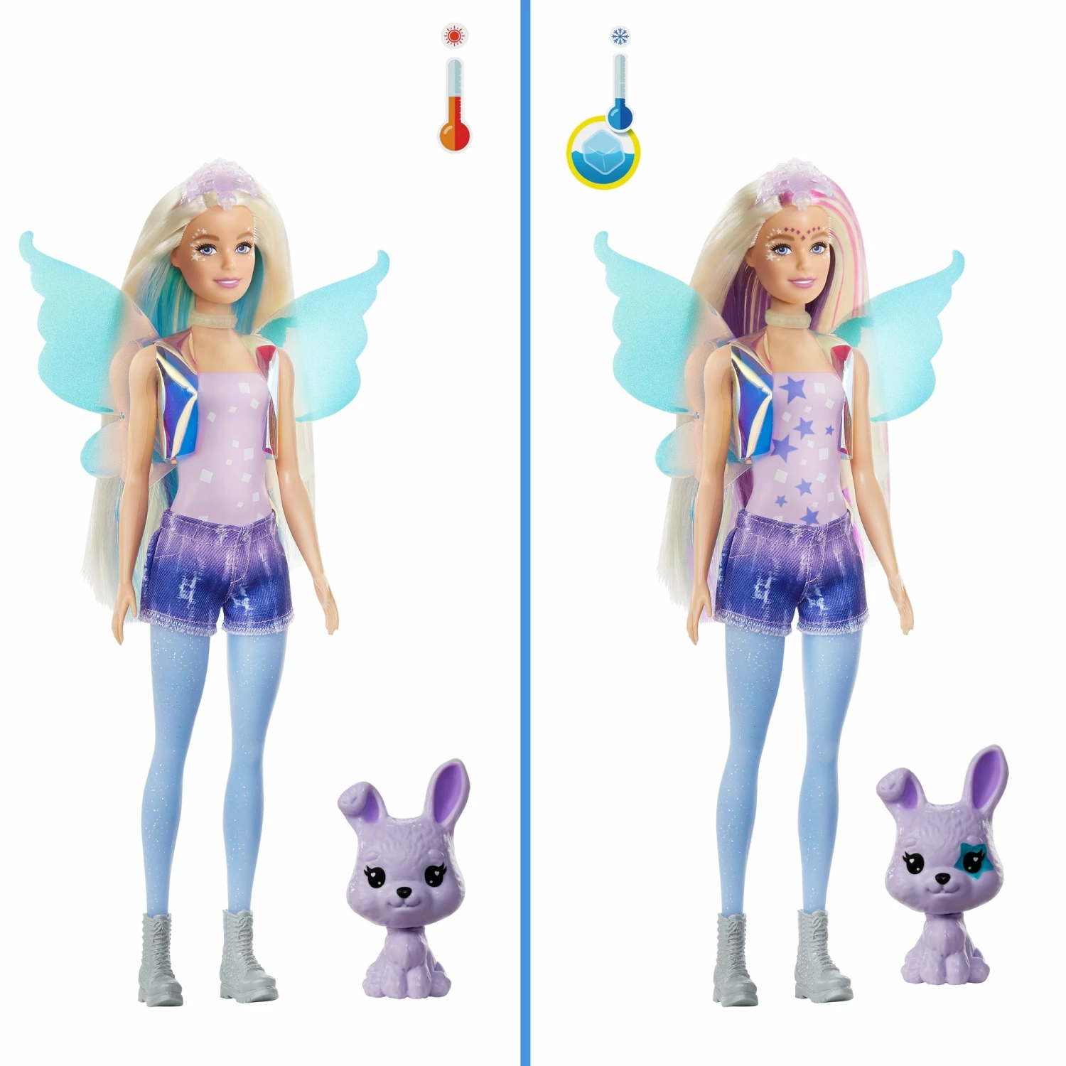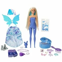 Barbie Color Reveal dolls deliver the ultimate unboxing experience — this set features 25 surprises, including 4 repeat color-change features, a pet bunny, two fantasy fashion fairy outfits, glitter and slime in a heart-shaped compact, a Barbie doll, a child-sized charm bracelet with two charms and a sticker! Play out fantasy fashion transformations over and over again. The packaging is part of the fun, too — remove the 16 mystery bags through the peel-able front panels. One of the surprise bags contains a mystery Color Revealâ„¢ doll partially covered in blue peelable coating. Kids peel to reveal the doll, then open the surprise bags to discover clothes and accessories for two complete fairy-inspired looks! And the surprises continue…peel to reveal the pet bunny, too! Dip the star-shaped sponge in ice-cold water to activate the color-change features — like on the doll’s face, bodice and hair! Color-change on the pet’s face adds to the surprise fun! With the use of warm and ice-cold water, kids can repeat the wow color-change moments over and over again! With so many surprises and pieces, kids will have so many stories to tell. Which doll will you reveal? Kids can collect them to mix and match accessories and expand the storytelling possibilities!