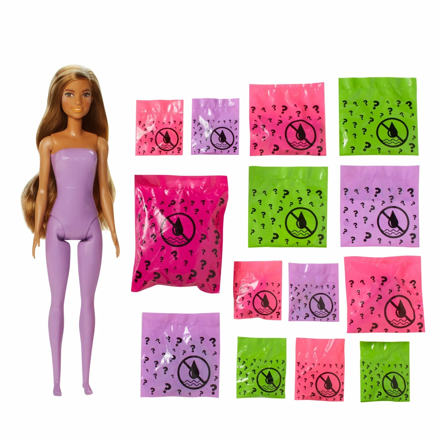 Barbie Color Reveal dolls deliver the ultimate unboxing experience — this set features 25 surprises, including 4 repeat color-change features, a ‘mer-pet,’ two fantasy fashion mermaid outfits, glitter and slime in a heart-shaped compact, a Barbie doll, a child-sized charm bracelet with two charms and a sticker! Play out fantasy fashion transformations over and over again. The packaging is part of the fun, too — remove the 16 mystery bags through the peel-able front panels. One of the surprise bags contains a mystery Color Reveal doll partially covered in purple peelable coating. Kids peel to reveal the doll, then open the surprise bags to discover clothes and accessories for two complete mermaid-inspired looks! And the surprises continue…peel to reveal the ‘mer-pet,’ too! Dip the seashell-shaped sponge in ice-cold water to activate the color-change features — like on the doll’s face, bodice and hair! Color-change on the pet’s face adds to the surprise fun! With the use of warm and ice-cold water, kids can repeat the wow color-change moments over and over again! With so many surprises and pieces, kids will have so many stories to tell. Which doll will you reveal? Kids can collect them to mix and match accessories and expand the storytelling possibilities!