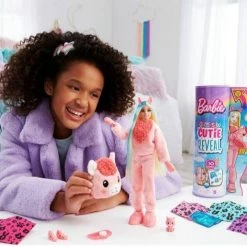 Barbie Cutie Reveal Fantasy Series dolls offer the cutest unboxing experience with 10 surprises, including a posable Barbie doll! Unbox the package to find a soft, plush llama friend and four surprise bags. Remove the party llama costume to find a Barbie doll with long hair and twinkle-shine details. Open the surprise bags to find shimmery clothes, accessories, a sponge-comb and a mini pet llama.