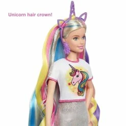 Unicorn or mermaid? Barbie® Fantasy Hair™ doll doesn’t need to choose — she comes with two fantasy looks that each include a colorful crown with hair extensions, themed top and accessories. The transformation to a mermaid or unicorn is easy! Put on the t-shirt with the unicorn graphic or use the one with the mermaid, then add the matching headpiece. The colorful hair extensions on the crown add even more colors to the pink, blue and glittery streaks in Barbie® doll’s long blonde hair. The set includes a brush, elastic hairbands and two clips so kids can create fantasy hairstyles, plus a pair of sneakers to expand the storytelling and styling options.