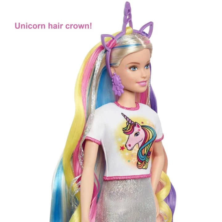 Barbie® Fantasy Hair™ doll comes with 2 fantasy looks — unicorn and mermaid — for an instant and easy fashion transformation!