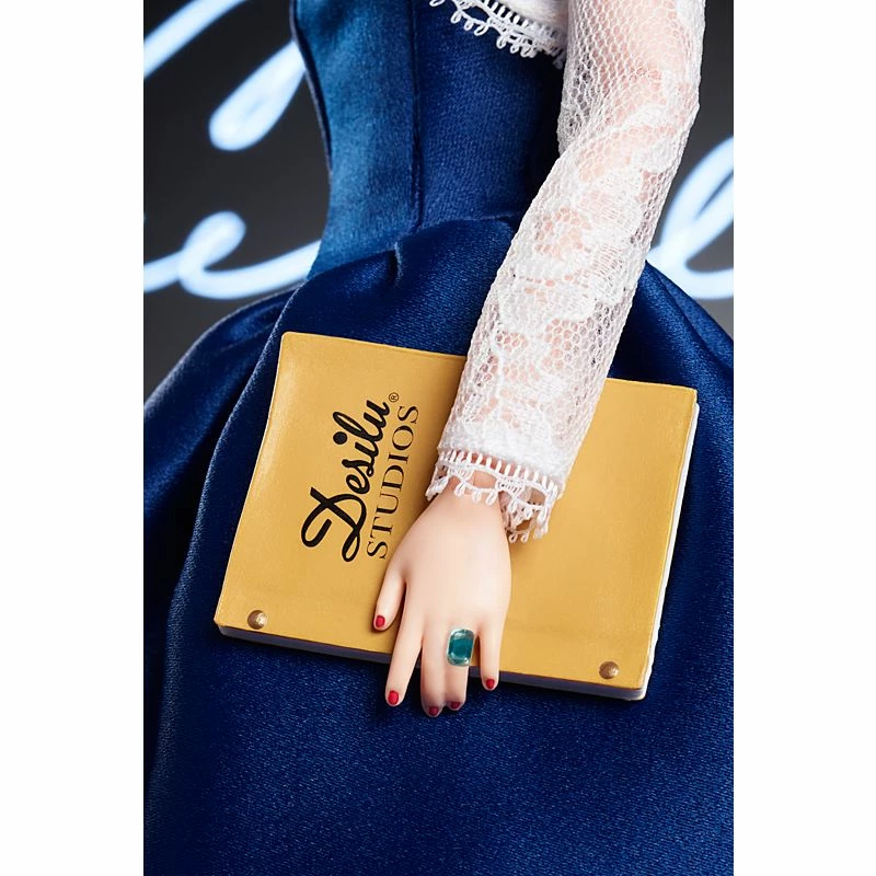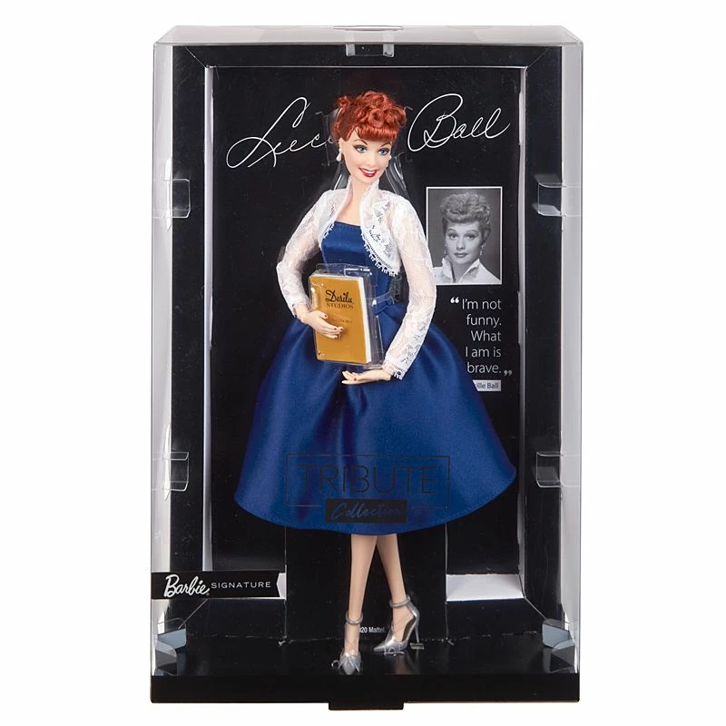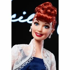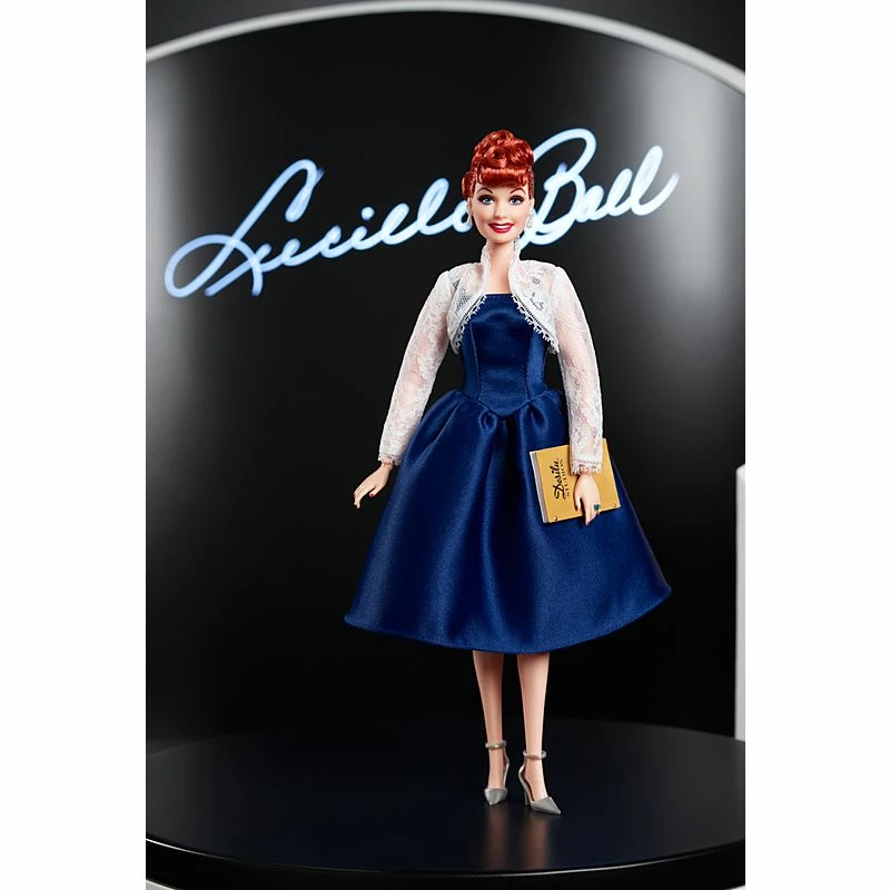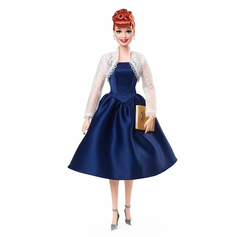 Barbie® honors her legacy with Lucille Ball Barbie® doll, dressed in a dazzling blue dress and white lace jacket, reminiscent of the ‘50s fashion era. Her look is complete with silver heels, “pearl” drop earrings, and her signature aquamarine engagement ring. Featuring a miniature Desliu Studios script replica and premium packaging,