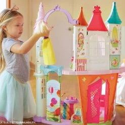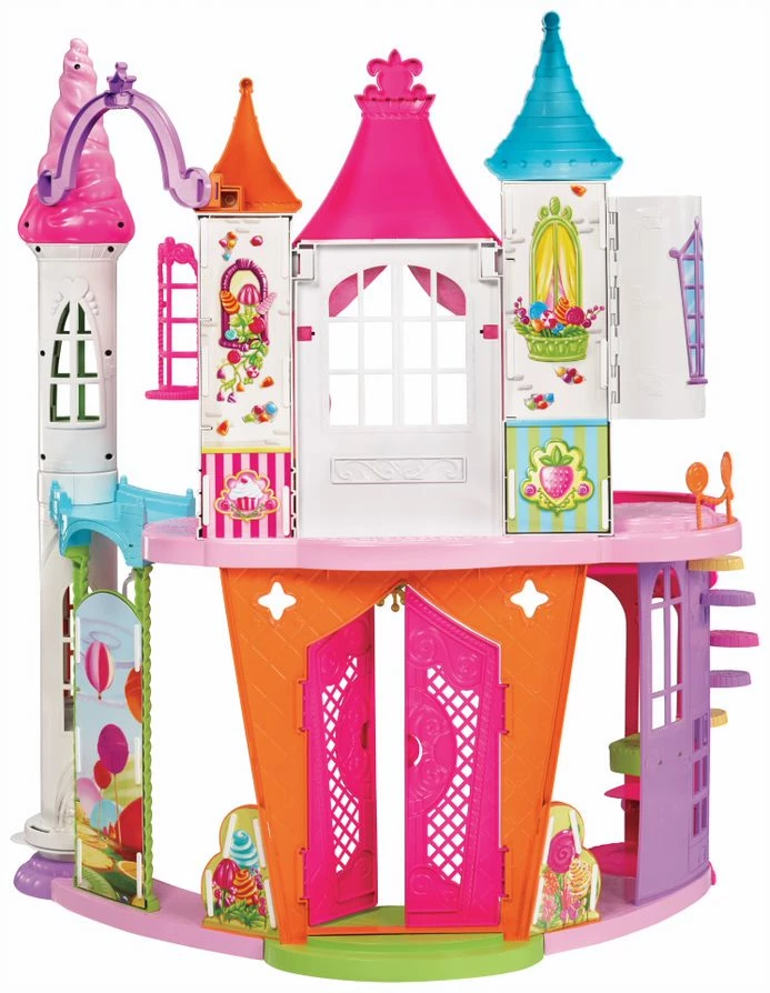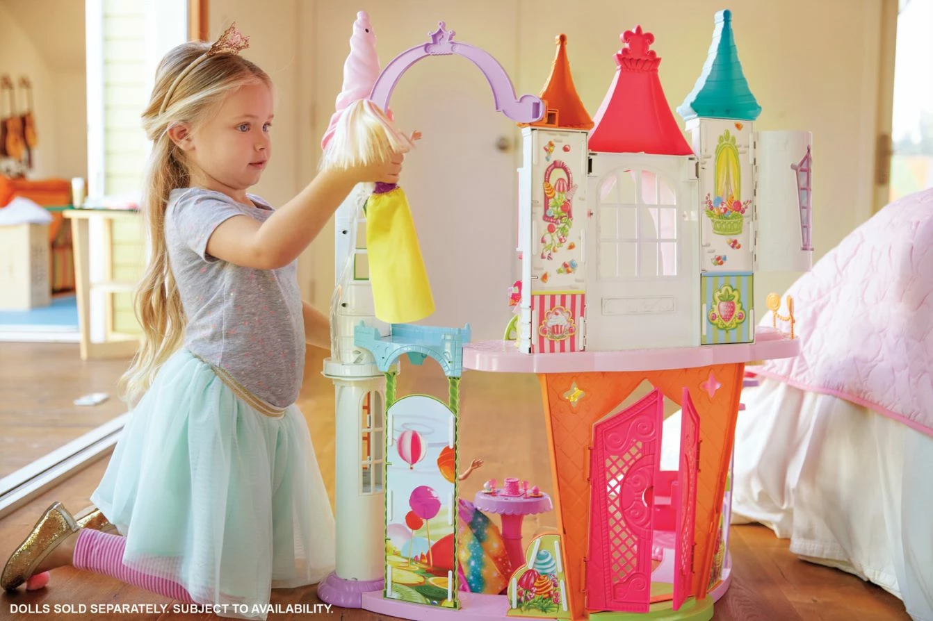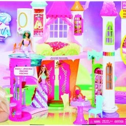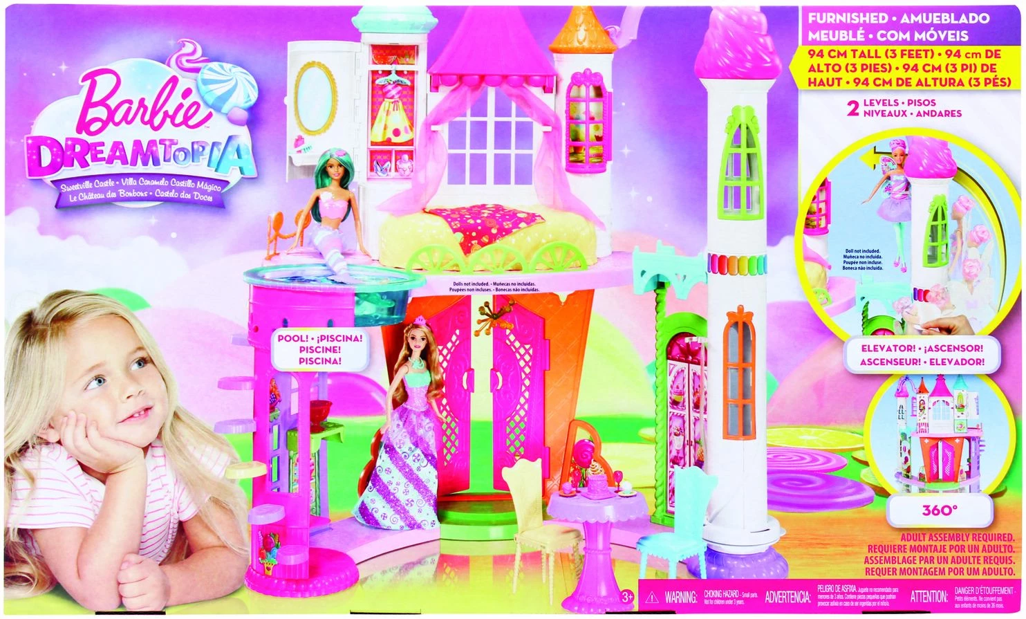 Enter the Barbie Dreamtopia Sweetville Castle and bring the world of mermaids, princesses and fairies to life. Inspired by the magic of Dreamtopia’s Sweetville Kingdom, the castle is full of delicious surprises! The large, two-story castle play set has bright colors and signature details on all angles, like cut-outs, windows and turrets. Inside, eight distinct play spaces inspire all kinds of storytelling. Classic spaces like the entryway, dining room, bedroom and bathroom have fairytale touches. A chandelier hangs by the front door to welcome guests. The first-floor dining area has room for the table, two chairs, two table settings, a punch bowl and food (all included!). A shelf on the wall holds the cake that looks good enough to eat. Travel between floors using the colorful spiraling steps or the elevator that easily swirls dolls up and down with child activation. The second-floor bedroom allows for sweet dreams with a fabulous princess bed and blankets, curtains, closet with hanger, vanity and storage nook. The bright, translucent pool is removable to dive deeper into fun. Young imaginations can dream up new adventures — there are so many rooms to explore and so many stories to tell! Collect all of the Barbie Dreamtopia Sweetville dolls and accessories to fill the house and satisfy your sweet tooth (each sold separately, subject to availability). Includes Barbie Dreamtopia Sweetville Castle, removable tub/pool, a table, two chairs, a bed and smaller accessories, like a blanket, hanger and table settings; doll not included. Colors and decorations may vary.