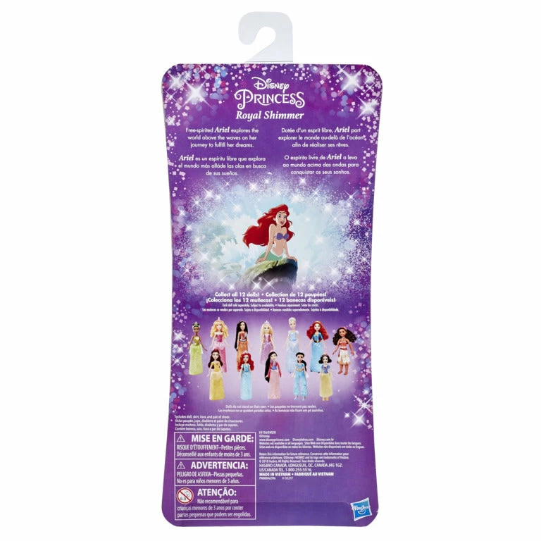 Kids can collect their favorite Disney Princess characters with the Disney Princess Royal Shimmer assortment! Each fashion doll is sold separately: Ariel, Cinderella, and Rapunzel. Each Princess toy shines in a signature color outfit that sparkles from the top of her bodice to bottom of her skirt! Little dreamers will love playing out magical moments from Disney Princess movies and imagining their own fairytales with these gorgeous dolls. Each sold separately. Subject to availability. Figure scale: 11 inches. WARNING: CHOKING HAZARD – Small parts. Not for children under 3 years