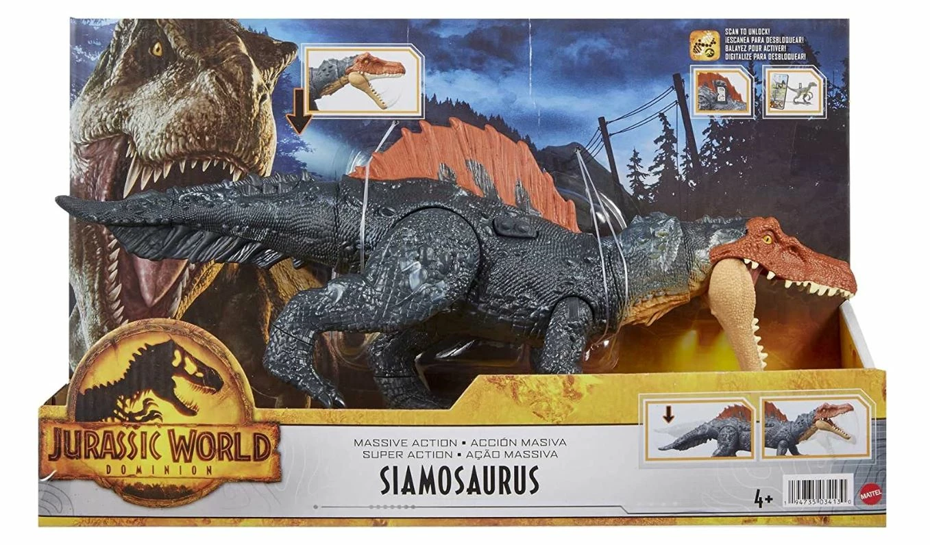 Jurassic World Dominion brings new thrills to dinosaur lovers. This Massive Action Siamosaurus is a carnivorous dinosaur figure that brings big adventures to life with species-specific neck thrashing action and aggressive CHOMP! With authentic sculpting and realistic colors and textures, this figure of the large carnivore with a cool stance is ready for action play or dynamic posing.