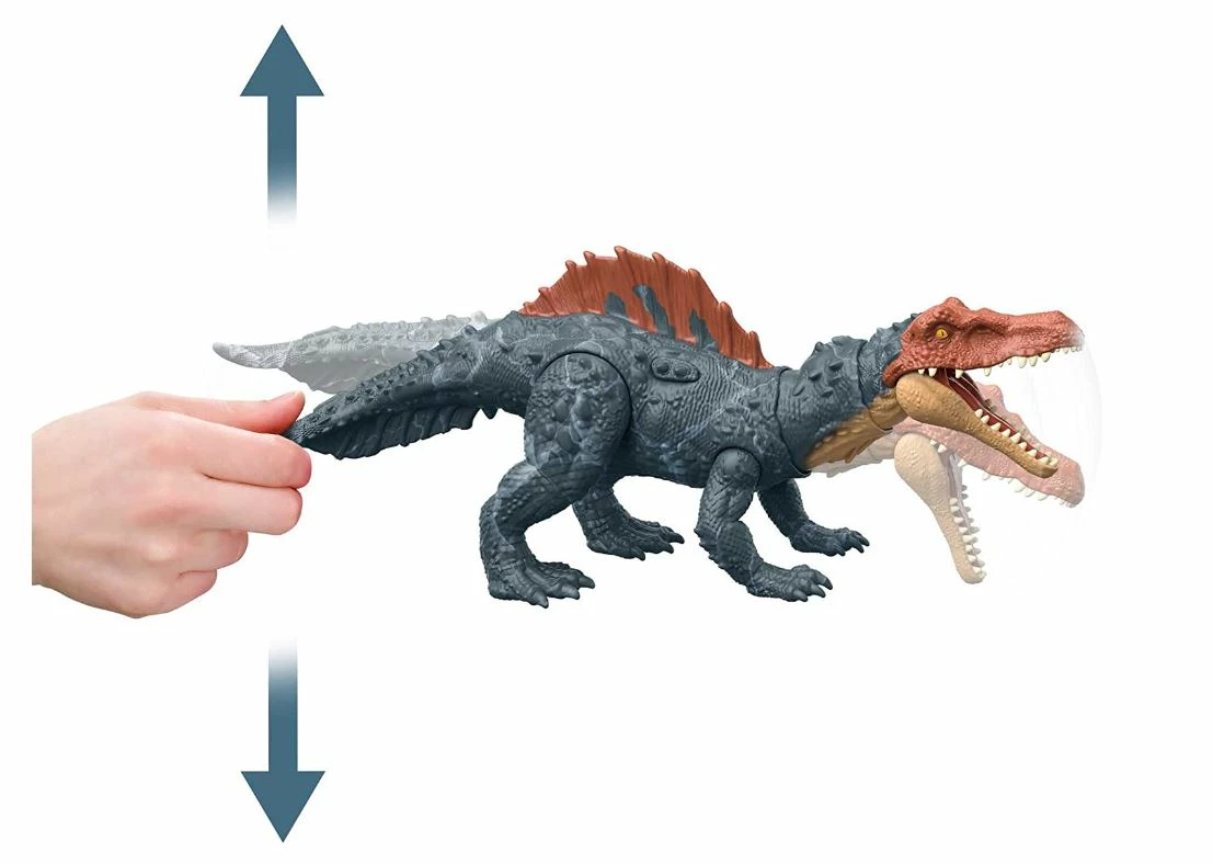 Press the button on top for frightening CHOMPING action with a wide-opening jaw. Then twist the tail for dynamic neck thrashing attack motion. Do both at the same time for added drama!