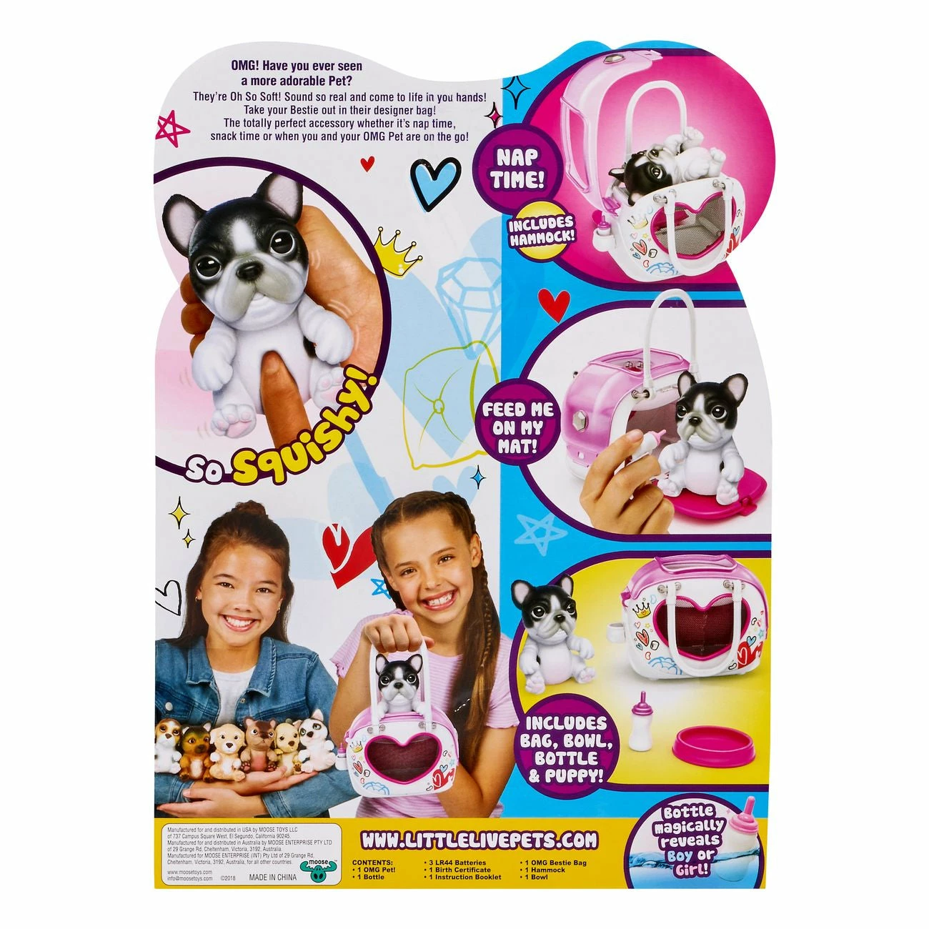 OMG! Have you ever seen a more adorable black and white French Bulldog? Take your new exclusive puppy anywhere in the Bestie Bag! The most stylish hand bag around. It has everything your puppy needs, with all the comforts of home in a designer bag! When it’s time to nap just open up the bag and place your puppy on the hammock! When it’s time to snack, pull down the side and feed your puppy on the mat with the bowl and bottle! Feed your puppy with it’s bottle and hear it eat, when you have finished, take the bottle out and you’ll hear a very satisfied puppy! Your OMG Pet’s bottle doesn’t just help feed, it will also magically tell you if your puppy is a boy or a girl by changing color when dipped in warm water! You’ll be amazed at how much love your puppy has and how stylish you’ll look as you hit the city together! “1 x Puppy