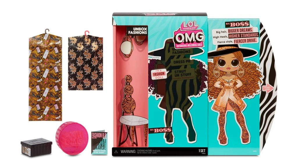 Da Boss is the big sister to fan favorite L.O.L. Surprise! character, Boss Queen. Unbox L.O.L. Surprise! O.M.G. fashion doll – Da Boss – with 20 surprises. She’s got big hair, but bigger dreams and high heels, but higher standards. She also has stunning features, beautiful, styled hair, and her own glam style. She’s the big sister to fan favorite L.O.L. Surprise! character, Boss Queen, and she comes with a totally unique unboxing experience. Slide package apart to reveal doll’s picture, bio and the first set of surprises. Her fashions are ready to be unboxed from fabulous garment bags, her shoes have their own shoebox, and her hat box holds her accessories. Keep unboxing to reveal the dressing room, where Da Boss is hanging out, ready to get dressed in her fierce fashions. Have her strike a pose to show her off on her included doll stand. The dressing room even becomes a reusable playset for Da Boss to strut her stuff. Each L.O.L. Surprise! O.M.G. includes a fashion doll, fierce fashions, shoes, a shoebox, accessories, a hat box, purse, a hair brush, a doll stand and a package that becomes a reusable playset. Collect all 4 L.O.L. Surprise! O.M.G. Series 3 fashion dolls. Find Da Boss’ little sister, Boss Queen, in the L.O.L. Surprise! Furniture School Office pack. Collect the whole family.