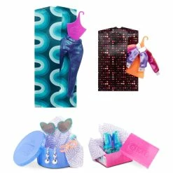 Package becomes reusable closet & dressing room playset for them to strut their stuff. Includes fashion doll, fashions, shoes, shoebox, accessories, hat box, purse, hair brush, garment bags, doll stand and reusable package playset.