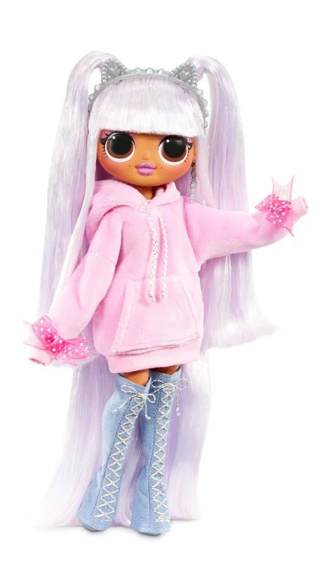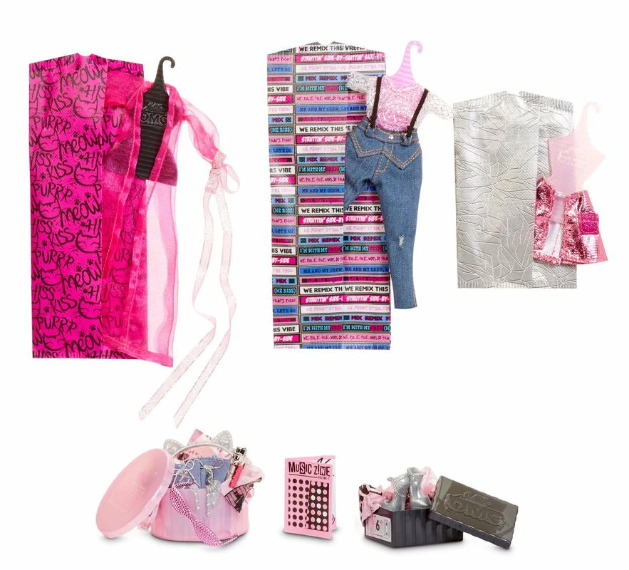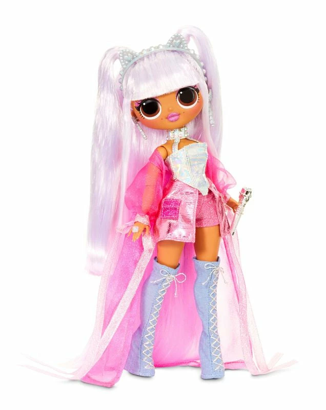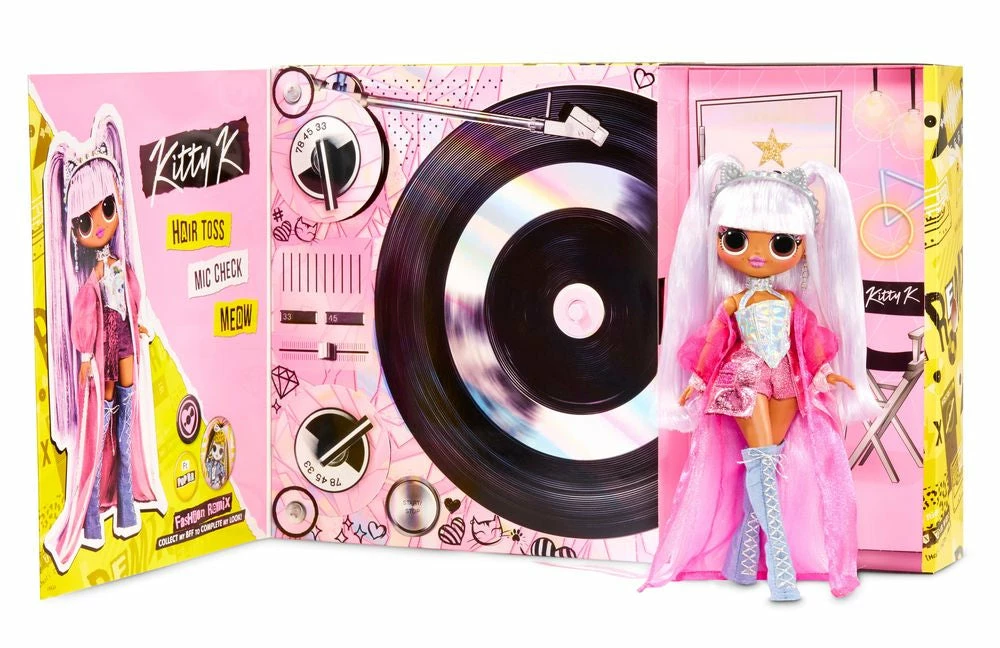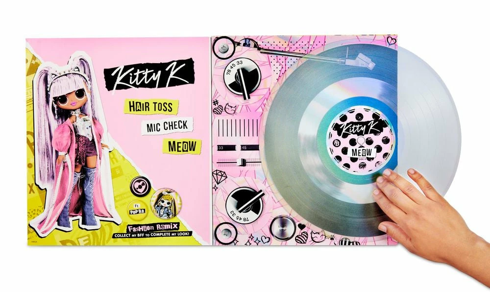 Unbox L.O.L. Surprise! O.M.G. Remix fashion doll – Kitty K – with 25 surprises. Kitty K is just an R&B diva, who lives for the spotlight in her shimmering coat and holographic bodysuit. She has stunning features, beautiful, styled hair, and her own showstopping style. She’s the big sister to fan favorite L.O.L. Surprise! character, Kitty Queen, and she’s ready for the ultimate concert – the So Extra Tour. But she needs your help, because everything got remixed! Unbox the full-size record and play it on her record player packaging. It really plays a Kitty K’s R&B piece of a surprise song. Then, get her ready for the show. Kitty K includes 2 complete fashion looks – but her 2nd outfit got remixed! Collect her BFF, Pop B.B., to complete her look just in time to take the stage! She also includes music accessories, so she’s ready for the concert. Have her strike a pose to show her off on her included doll stand. She also includes her magazine with the lyrics to her piece of the song. Collect all the lyric sheets from the whole L.O.L. Surprise! Remix line to reveal the whole song. Or, mix & match lyrics to create your own Remix. Each L.O.L. Surprise! O.M.G. Remix includes a fashion doll, 2 fashion looks, 1 pair of shoes, a shoebox, accessories, a hat box, a hair brush, a doll stand, a full-size record, a lyric magazine and a package that really plays music. Collect all 4 L.O.L. Surprise! O.M.G. Remix fashion dolls. Collect the whole L.O.L. Surprise! Remix line to collect all the song lyrics and complete the surprise song.
