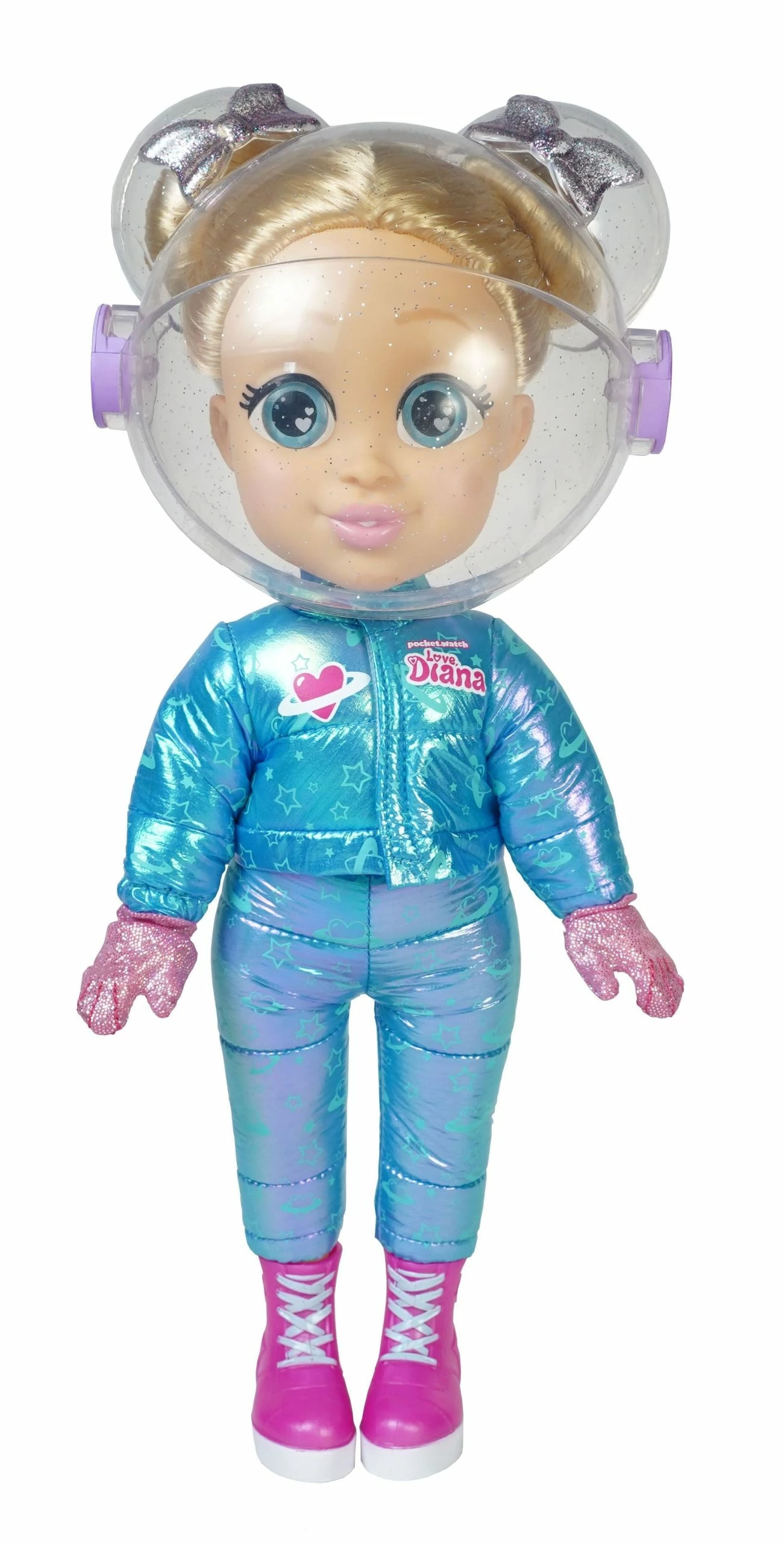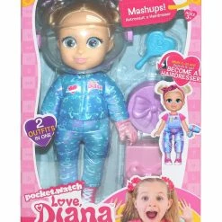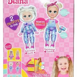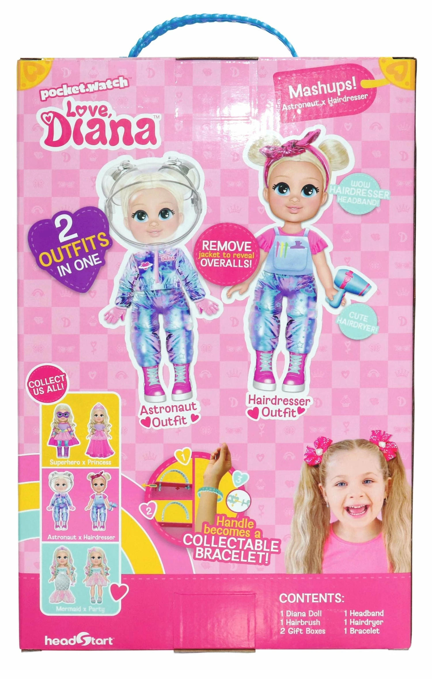 Accessories for Diana include: astronaut spacesuit that transforms to a hairdresser outfit, astronaut helmet, shoes, hairdryer accessory, hairbrush & headband.