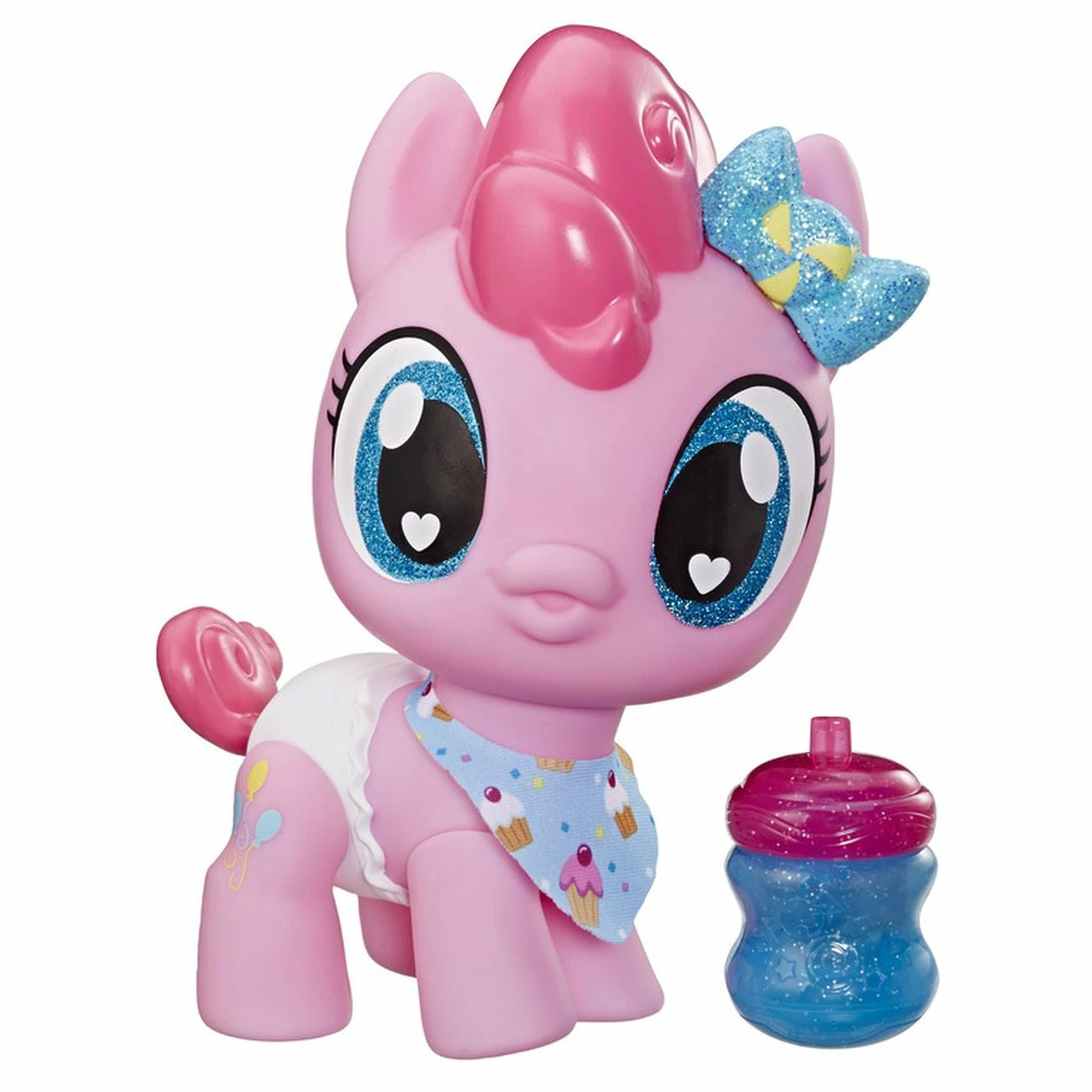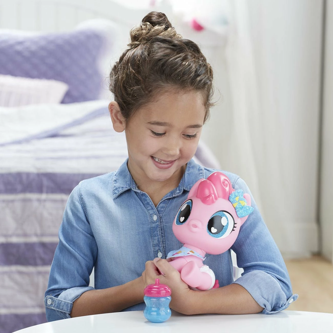 Cuddle and play with an adorable baby pony doll! 7.5-inch My Baby Pinkie Pie doll has a molded diaper and removable bib and bottle accessories. Feed Pinkie Pie her bottle to activate the sounds that come from the bottle! Poseable figure can sit or stand, and is made of soft plastic for kids to cuddle and hug. This Pinkie Pie pony figure has a molded candy-shaped bow and cupcake-pattern bib inspired by her character in the My Little Pony: Friendship is Magic TV show and My Little Pony: The Movie. Figure has beautiful glittery eyes and entertainment-inspired features, including signature Pinkie Pie cutie mark of 3 party balloons and a molded pink mane and tail. This My Little Pony toy is a fun baby doll for 3 year old girls and boys and older. Also look for My Baby Twilight Sparkle doll! (Sold separately. Subject to availability).