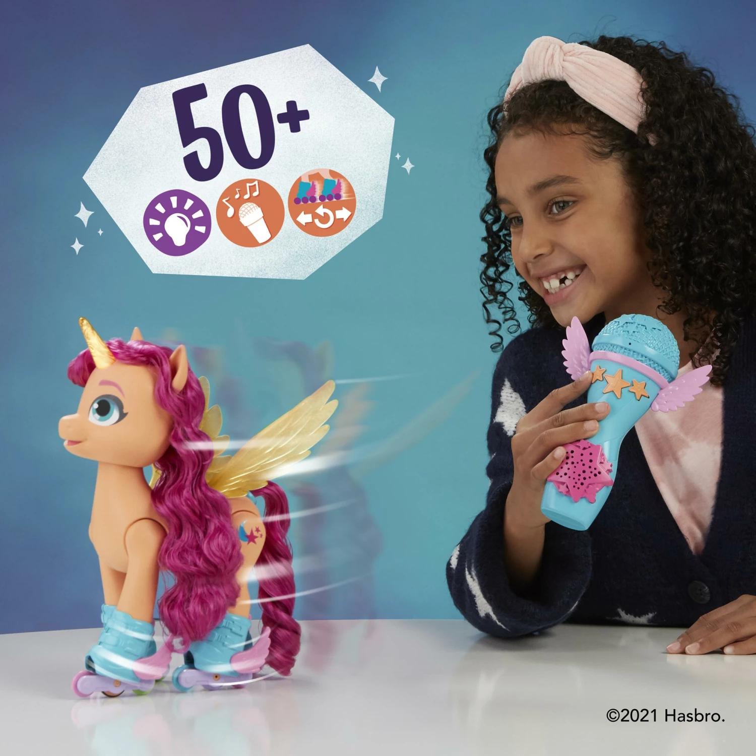 Get to know Sunny Starscout: an adventurous pony from Maretime Bay! Sing ‘N Skate Sunny Starscout is an interactive pony figure that kids can control. Comes with a cordless microphone that can be used for singing or as a remote control. Use the buttons on the microphone to move the figure forward or spin her around. Kids can also shake the RC microphone to make the figure move! Figure moves her heads and wings while she skates and sings part of the song “Gonna Be My Day.” Features over 50 combinations of lights, sounds, and movement.Â