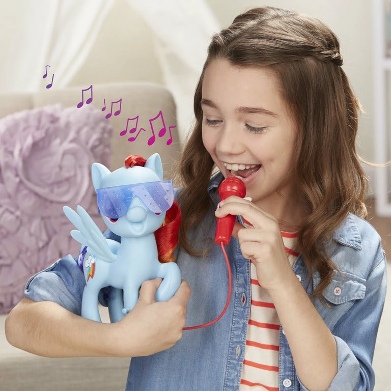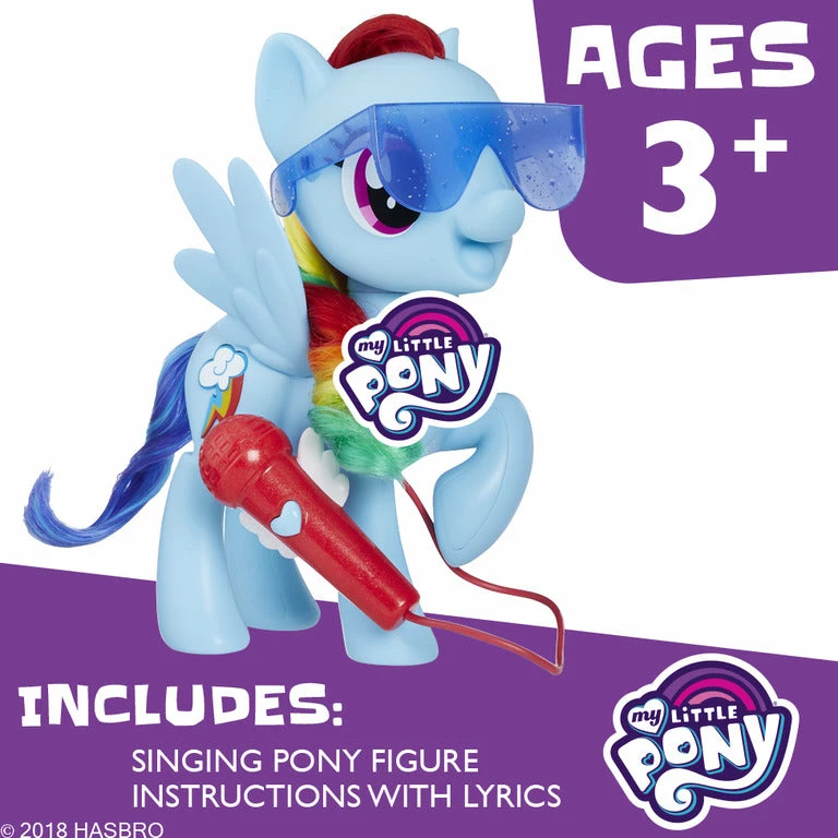 Rainbow Dash knows what it takes to be awesomely amazing, especially at singing! The Singing Rainbow Dash pony figure has cool sunglasses and a microphone attached to her — press her Cutie Mark to hear her sing “Time to Be Awesome” from My Little Pony: The Movie, the theme to the My Little Pony: Friendship is Magic animated television series, and 3 more songs! Press the button on her microphone and use the included lyrics sheet to sing along with Rainbow Dash! Press the button and sing any song without the music or help from the Rainbow Dash pony figure. She says 15 entertainment-inspired phrases and rocks her signature rainbow hair. Whether kids listen to her sing, sing along, or sing alone, the Singing Rainbow Dash pony figure spreads the magic of friendship through song!