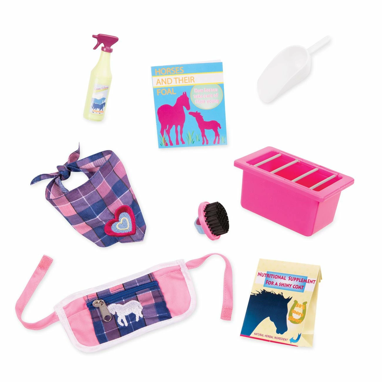 The Quarter Horse Foal has a brown body with white “socks” on its legs, and a dark brown mane and tail. Practice giving your foal different hairstyles – the silky-soft hair is fun to brush! Dress the foal in a cozy and cute plaid blanket wrap. The matching plaid scarf and fanny pack for dolls will let them be twinsies for the day! The assortment of grooming and feeding accessories will help your doll take extra-good care of their foal.