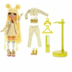 Collect the Rainbow of beautiful fashion dolls with Rainbow High. Introducing Sunny Madison. She’s dressed in yellow from head to toe, and she has gorgeous features, long eyelashes and beautiful, brushable hair. She’s fully articulated and posable. Her arms and legs bend, so she can strike tons of glamorous poses. Sunny comes with 2 complete outfits to mix and match for bold, showstopping looks. She has quirky-cute style makes all her BFFs smile. She comes with a sparkly dress, two jackets, rainbow socks, sparkly jeans and more! And her golden rainbow platform shoes are next level. Also includes hair comb, two hangers and a doll stand.