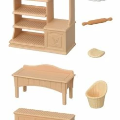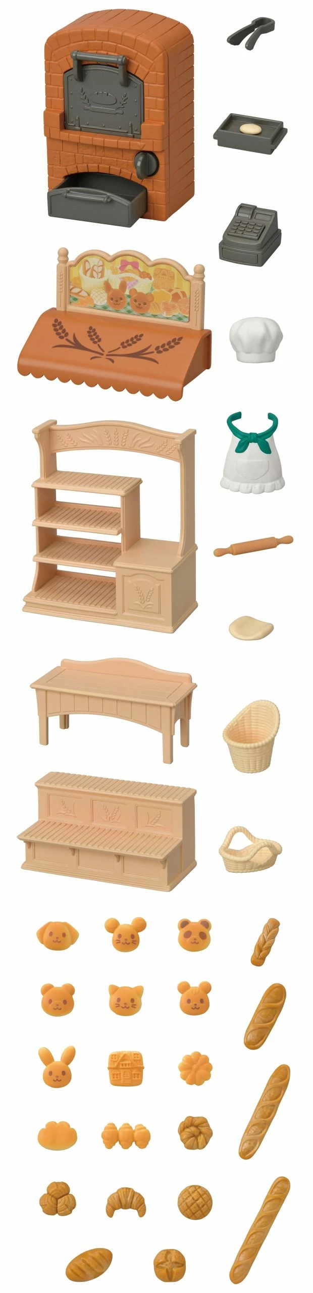 The Bakery Shop Starter Set comes with lots of toy baked goods for role play fun. Place the bread on the oven tray, turn the dial, and bake the bread. Combine with the Red Roof Cosy Cottage (sold separately) to turn the house into a bakery. Combine the included signboard with the Red Roof Cosy Cottage balcony (sold separately) and dress the Chocolate Rabbit Girl in the apron and hat to turn the house into a bakery. You can also combine the signboard with the Family Picnic Van (sold separately) to turn the van into a mobile bakery. The set includes: Oven, Drawer, Oven tray, register, signboard, Awning, Shelf, Display stand, Table, Hat, Apron, Basket, Basket tray, Tongs, Rolling pin, Dough, Rabbit bun, Squirrel bun, Mouse bun, Bear bun, Cat bun, Dog bun, Panda bun, House bun, Bread roll, Pumpkin bun, Custard bun, Round loaf, Braided bread, Melon shaped bread, Rye bun, Croissant, Crusty loaf, Twist bun, Batard, Parisian, Baguette (a total of 37 pieces).