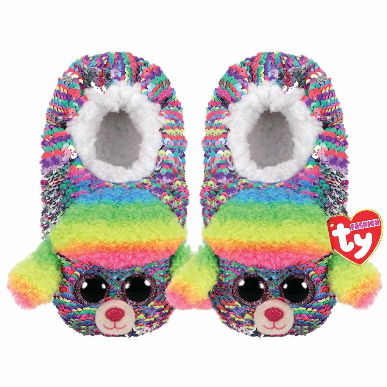 Ty Fashion Sequin Slippers combine the magic of Flippable Beanie Boos with the comfort of slippers. Each slipper is lined with soft, breathable fabric with an elastic upper rim to ensure maximum comfort. Styled after your favourite Flippable Beanie Boo characters, there is a pair Sequin Slipper socks for everyone! US SIZE CHART: